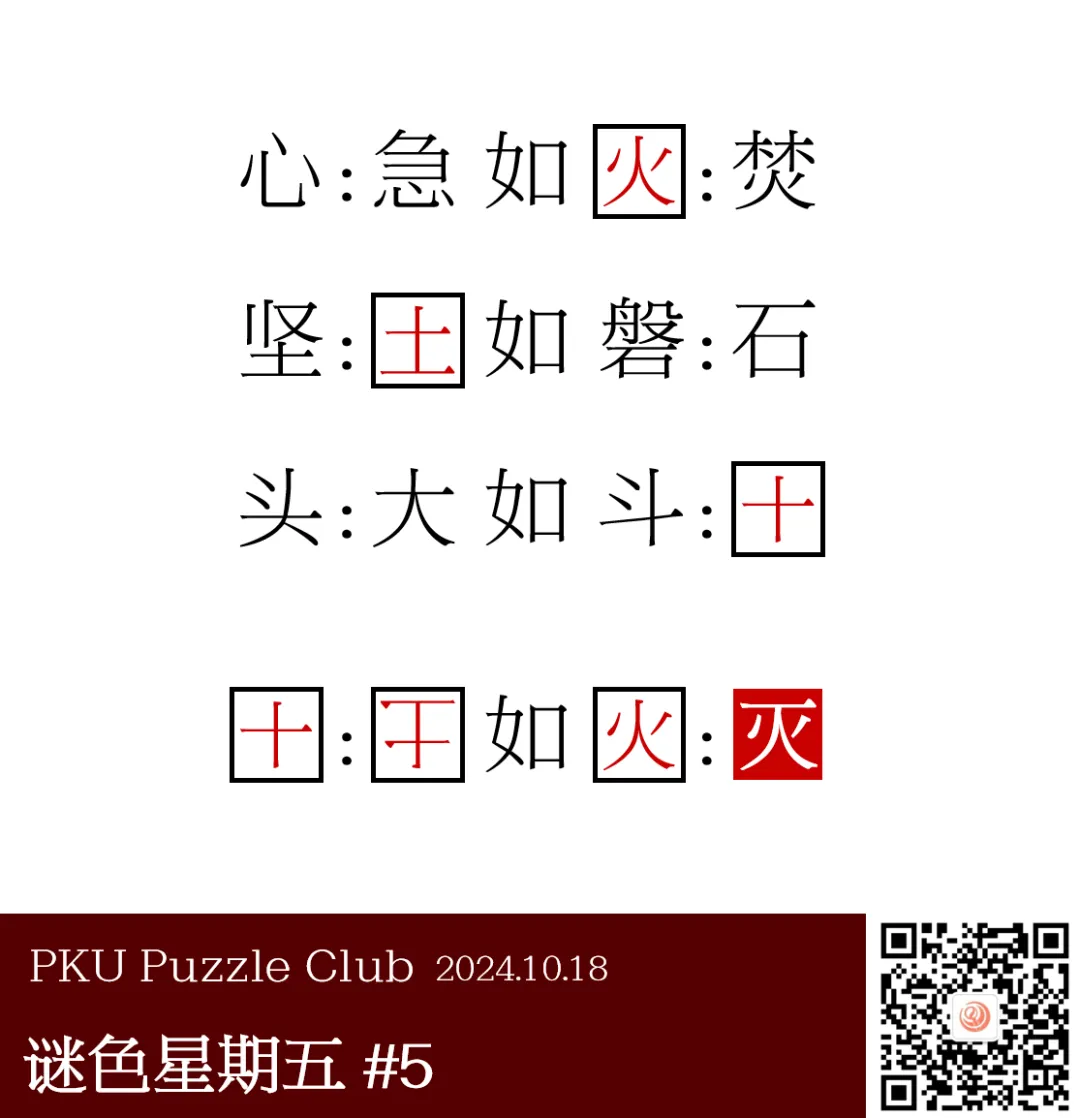 这道题目最开始的版本是只有“头:大 如 斗:?”,答案是“十”。 大家觉得例子太少,规律不容易确定,而且得出答案也有点太快了,所以后来多加了一点例子。 最初的最后一行形式是“十:土 如 火:灭”,但是添加横 线的位置不太对,所以最终采用了把土倒过来的形式。 最终形式在规律上确实更为一致了。
