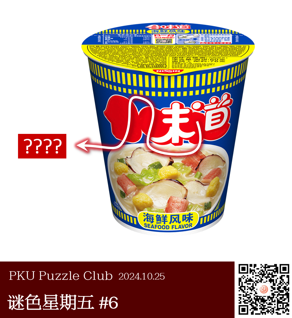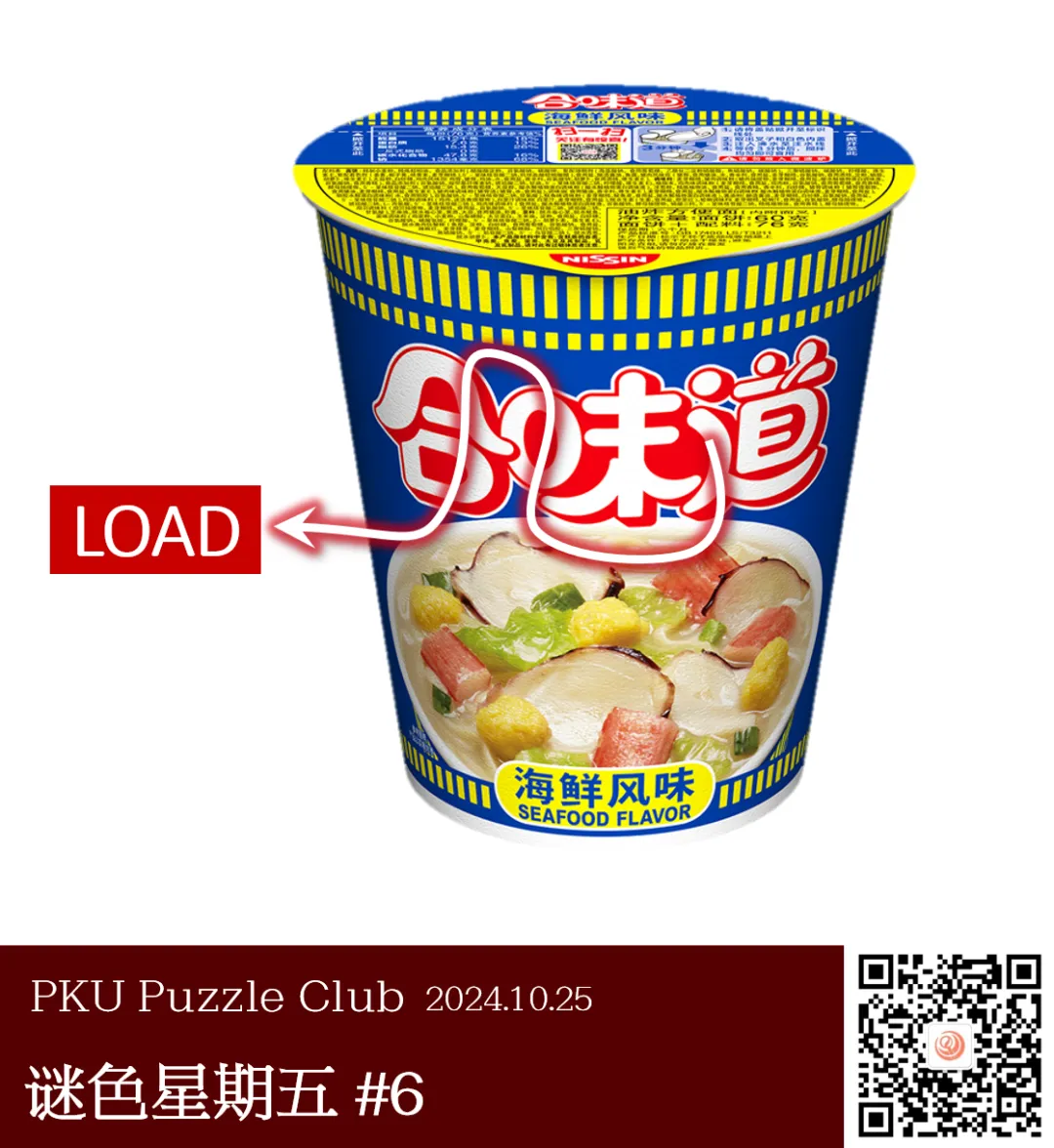 图中给出了一桶杯面的示意图,但其正面杯壁上的 LOGO 缺失了一部分。 通过对比原先“合味道”的 LOGO 可以发现,缺失的部分是四个白色区域, 而这四个白色区域分别形似 L、O、A、D 四个字母(按箭头顺序),因此答案是 LOAD。