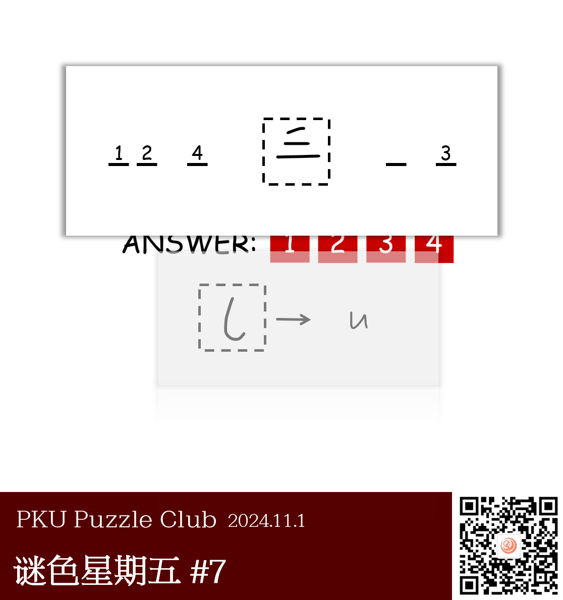但是,因为卡片是透明的,所以也可以把它翻面再叠到白纸上! 这个时候,原先透明卡片上的 u 就翻面成了 N,拼成的汉字也变成了“手”,左侧的四字母单词是 HAND,因此 1、2、4 号字母是 H, A, D。